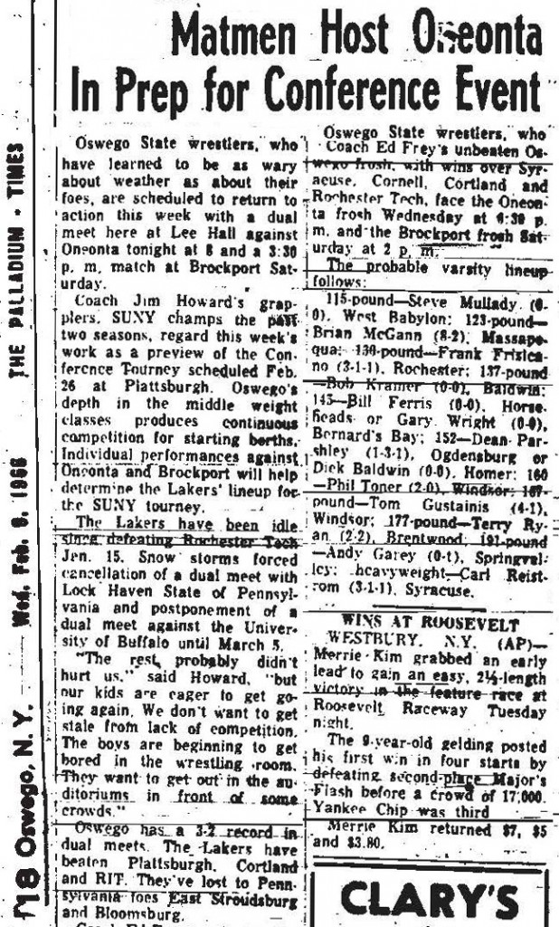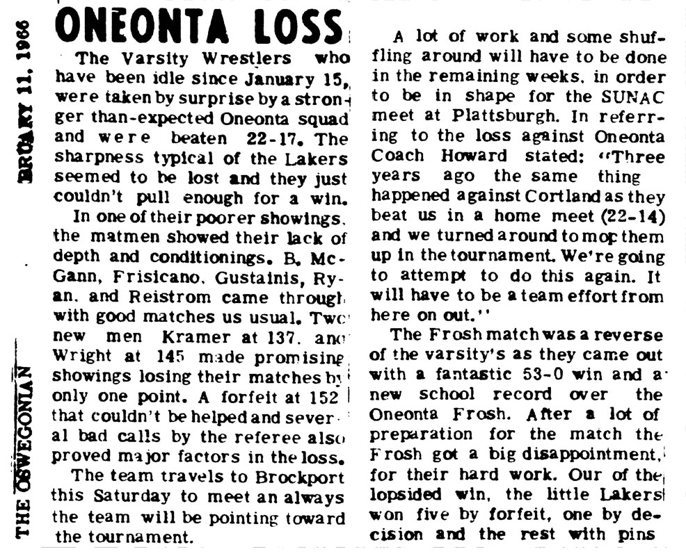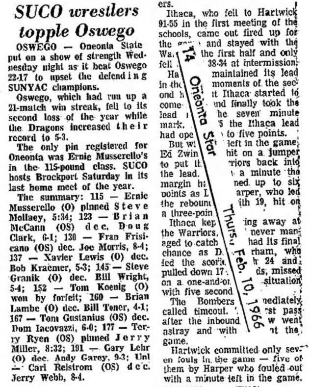 Oneonta State put on a show of strength Wednesday night as it beat Oswego 22-17 to upset the defending SUNYAC champions. SOURCE: Oneonta Star, February 10, 1966.