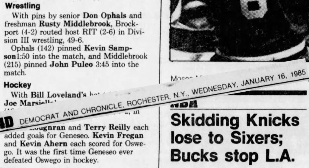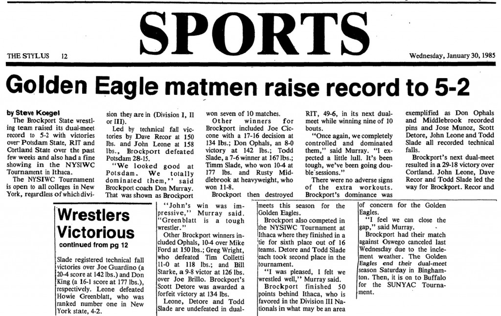 The Brockport State wrestling team raised its dual-meet record to 5-2 with victories over Potsdam State, RIT and Cortland State over the past few weeks and also had a fine showing at the NYSIWC Tournament in Ithaca. SOURCE: The Stylus, SUNY Brockport, January 30, 1985. Reproduced by armdrag.com with permission.
