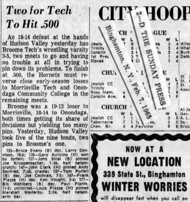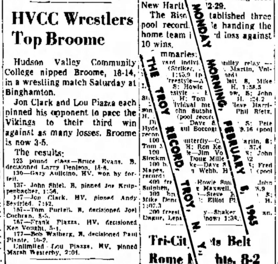 Hudson Valley Community College nipped Broome, 18-14, in a wrestling match Saturday at Binghamton. SOURCE: The Troy Record, February 8, 1965.