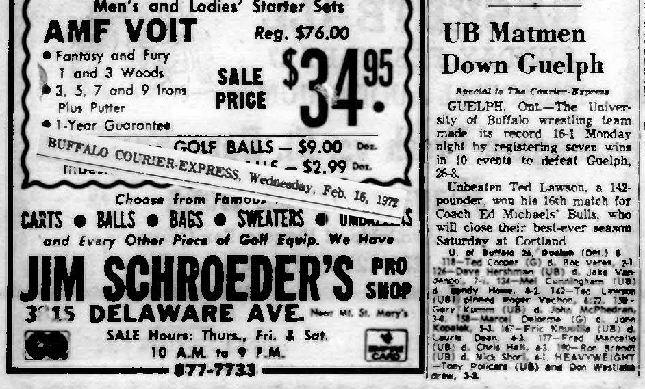 Co-Capts. Ted Lawson and Ron Brandt will wrestle their final regular-season matches of the season Saturday afternoon when the University of Buffalo travels to Cortland State College. SOURCE: Buffalo Evening News, February 15, 1972. Reproduced by armdrag.com with permission.
