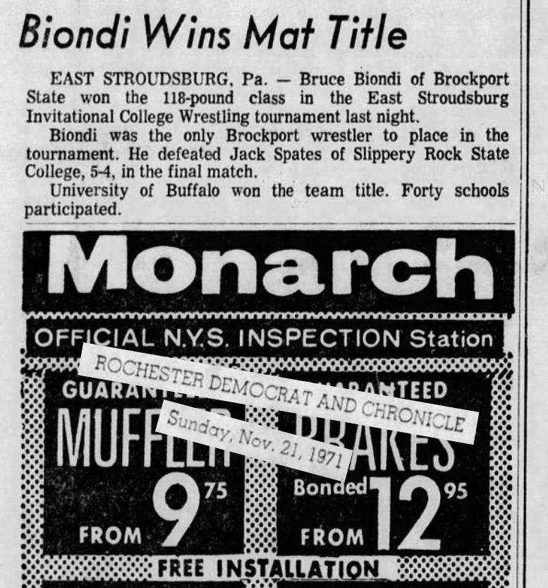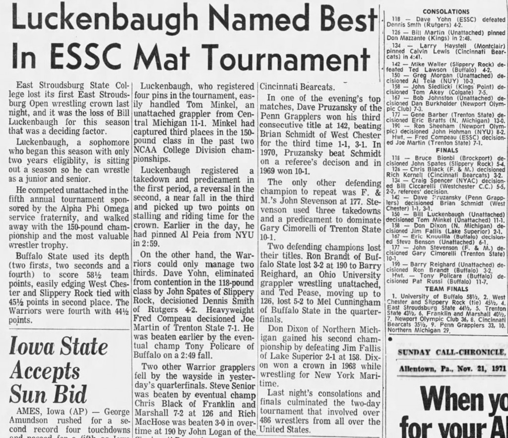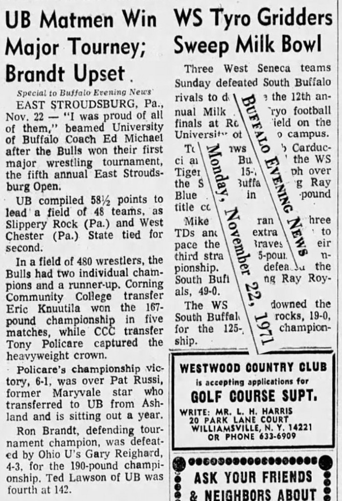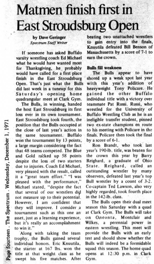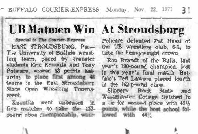 "I was proud of all of them," beamed University of Buffalo Coach Ed Michael after the Bulls won their first major wrestling tournament, the fifth annual East Stroudsburg Open. SOURCE: Buffalo Evening News, November 22, 1971. Reproduced by armdrag.com with permission.