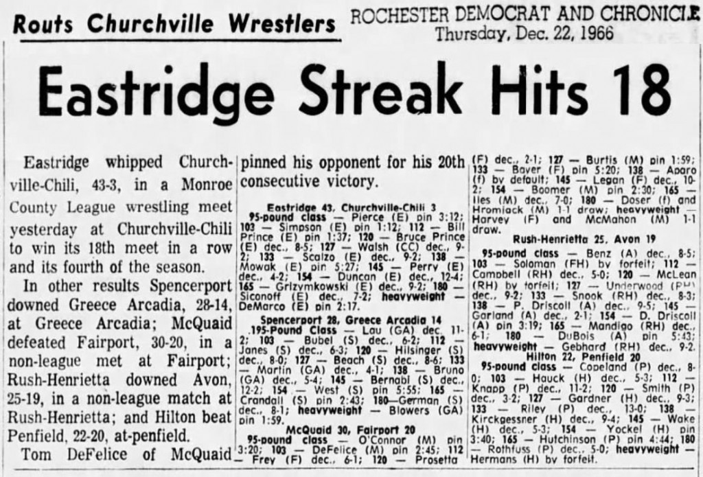 Rush-Henrietta downed Avon, 25-19, in a non-league match at Rush-Henrietta. SOURCE: Rochester Democrat and Chronicle, December 22, 1966. Reproduced by armdrag.com with permission.