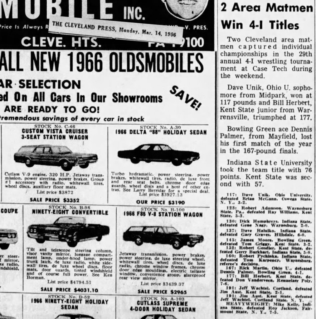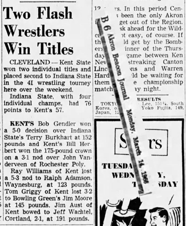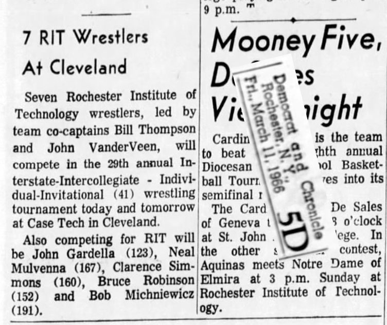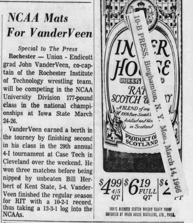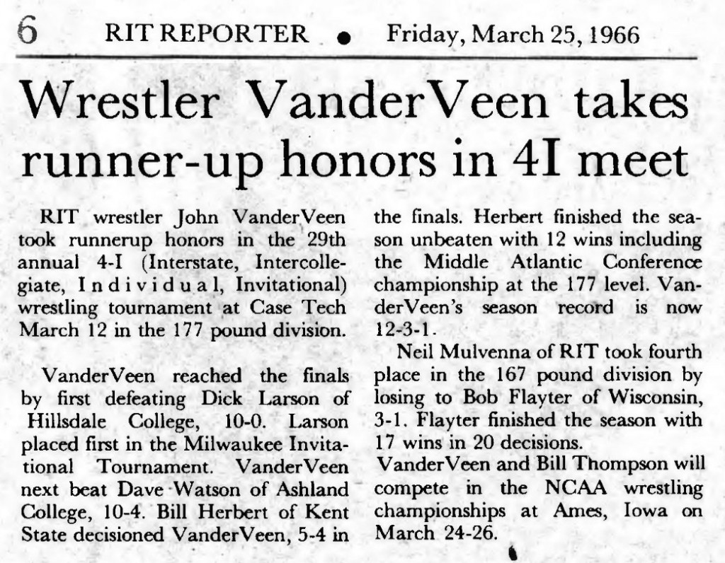 John VanderVeen of Rochester Tech took runnerup honors in the 29th annual 4-I wrestling tournament at Case Tech yesterday in the 177 pound division. SOURCE: Rochester Democrat and Chronicle, March 13, 1966. Reproduced by armdrag.com with permission.