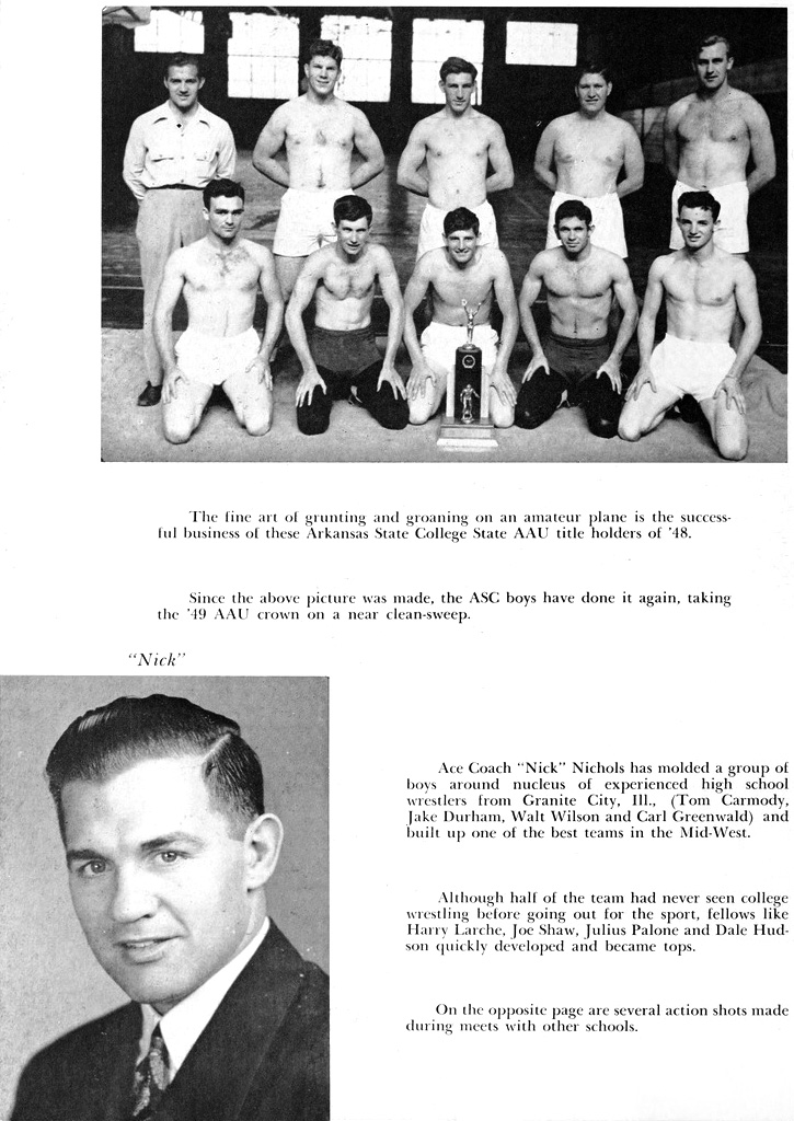 WRESTLING. The fine art of grunting and groaning on an amateur plane is the successful business of these Arkansas State College AAU title holders of '48. SOURCE: 1949 Indian.