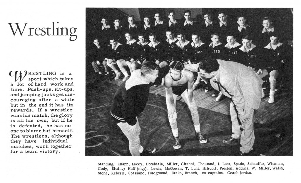 WRESTLING. FOREGROUND: Drake, Branch (co-captains), Coach Jordan. FRONT ROW: Huff (manager), Lewis, McGowan, T. Lunt, Hilsdorf, Preston, Adduci, W. Miller, Walsh, Stone, Keberle, Spaziano. BACK ROW: Knapp, Lacey, Dorabiala, Miller, Ciranni, Thousand, J. Lunt, Spade, Schaeffer, Wittman, Cody. SOURCE: 1954 Panorama.
