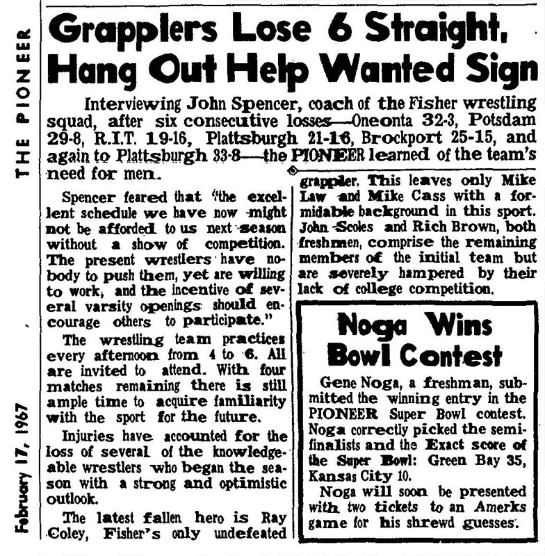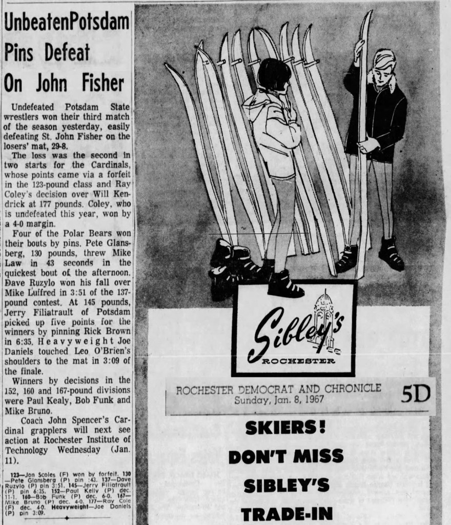 Undefeated Potsdam State wrestlers won their third match of the season yesterday, easily defeating St. John Fisher on the losers' mat 29-8. SOURCE: Rochester Democrat and Chronicle, January 8, 1967. Reproduced by armdrag.com with permission.