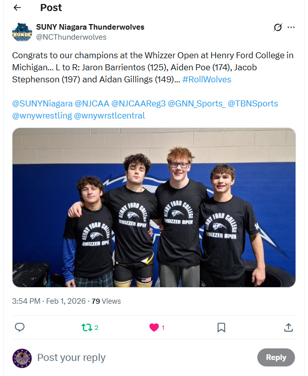 SUNY Niagara's champions at the Whizzer Open at Henry Ford College in Michigan. L to R: Jaron Barrientos (125), Aiden Poe (174), Jacob Stephenson (197), Aidan Gillings (149). Shared by SUNY Niagara Athletics.