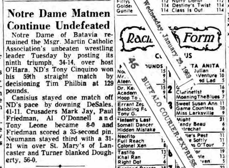 Neumann stayed third with a 31-21 win over St. Mary's of Lancaster. SOURCE: Buffalo Courier-Express, January 29, 1969.