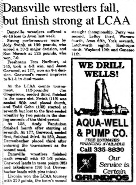 Dansville wrestlers suffered a 46-16 loss to Avon last week. SOURCE: Genesee Country Express, Thursday, February 13, 1992.