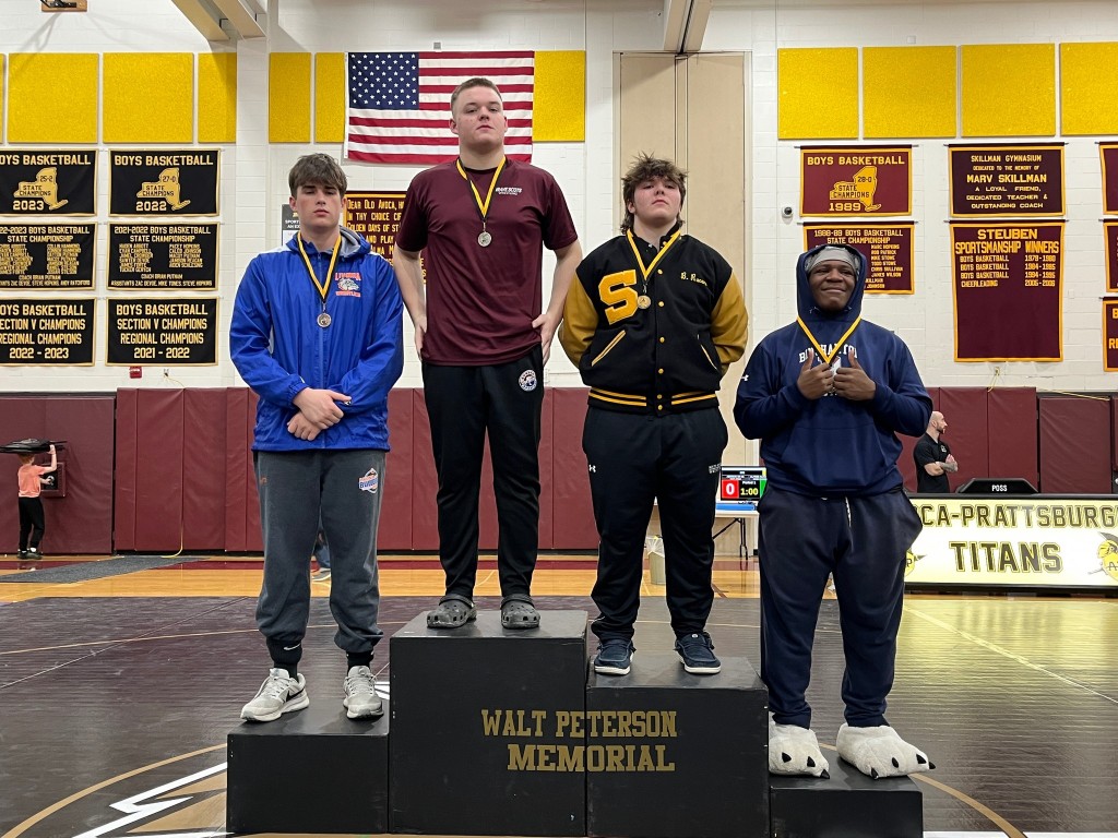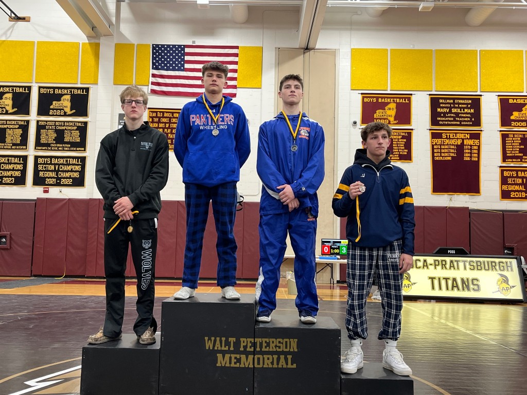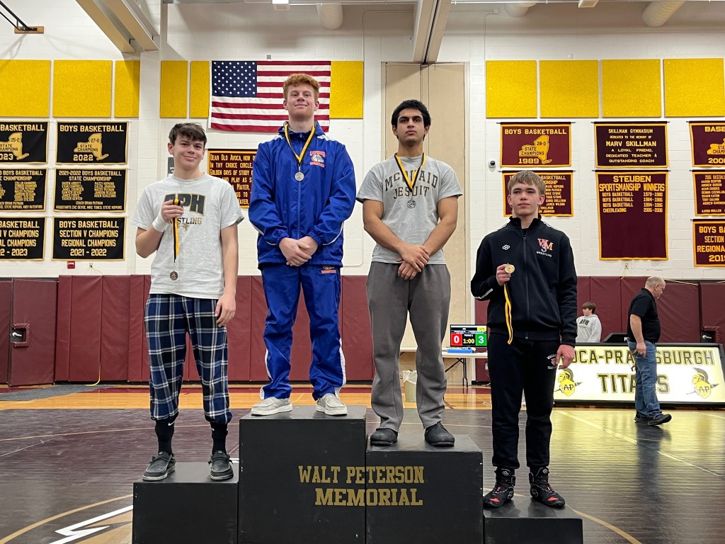 McQuaid Jesuit's Colin Zito won his third Outstanding Wrestler award of the season after defeating returning NYS place winner Lukas Mills-Travis (Bath) in 118-pound final of the Walt Peterson Memorial tournament at Avoca. Photo shared by the Zito Family.