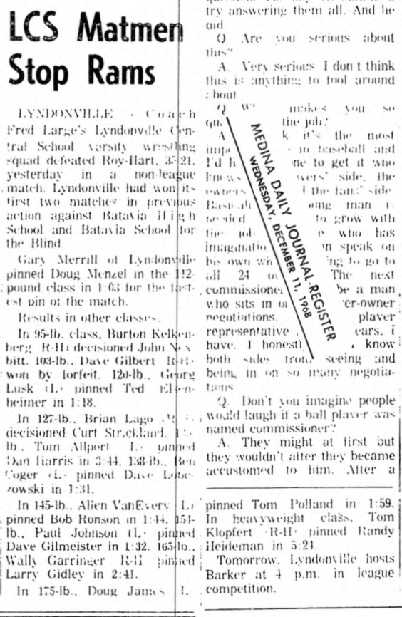 Jerry Merrill's 1-minute, 3-second pin of Dog Menzel highlighted Lyndonville Central's third wrestling victory without a loss, a 35-21 non-league triumph over Royalton-Hartland. SOURCE: Buffalo Evening News, December 11, 1968. Reproduced by armdrag.com with permission.