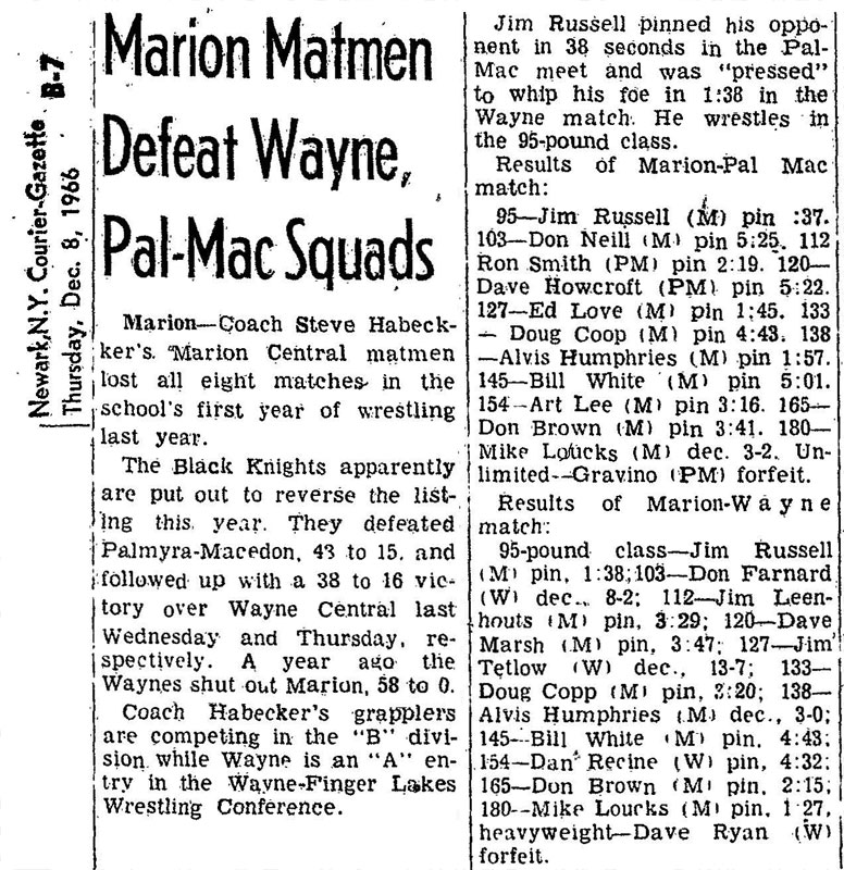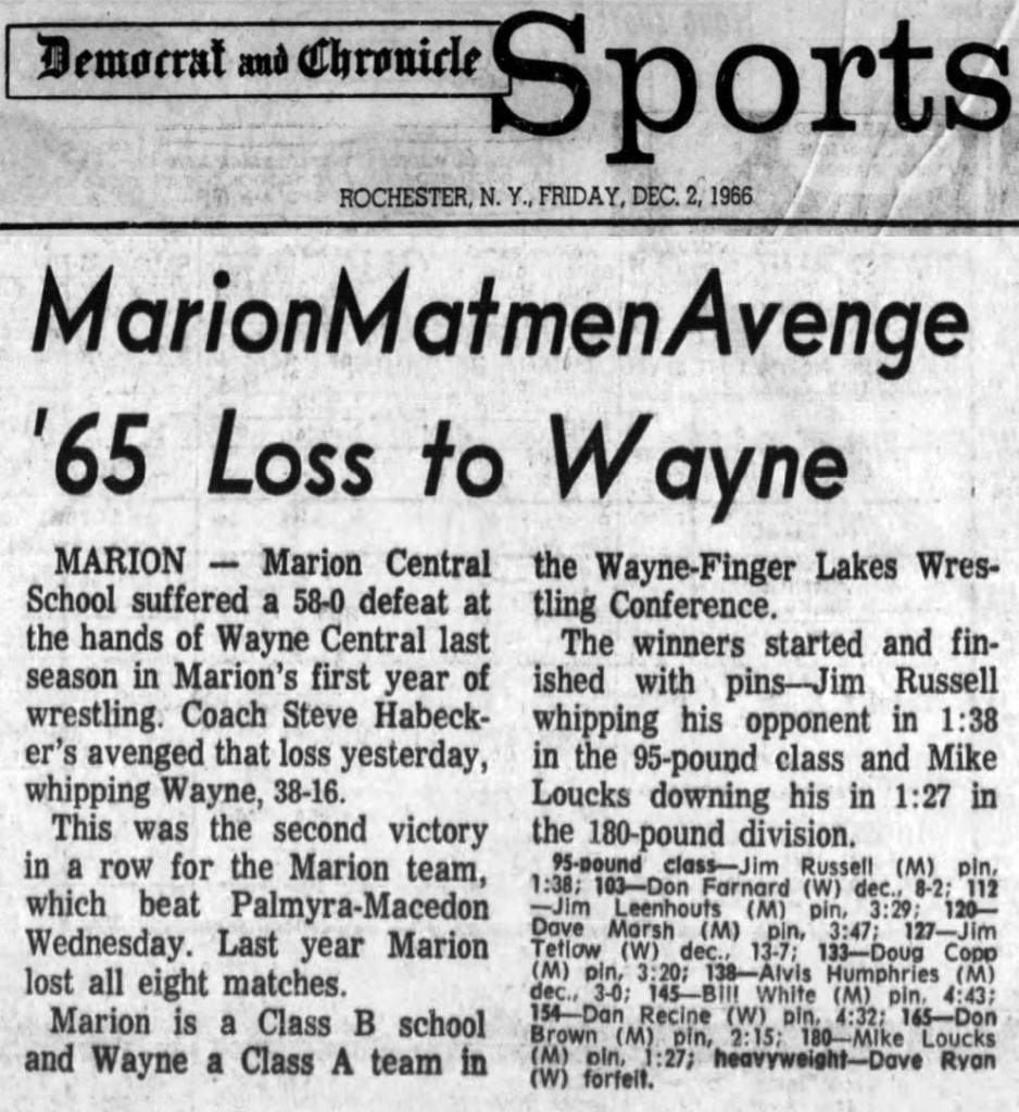 Marion Central School suffered a 58-0 defeat at the hands of Wayne Central last season in Marion's first year of wrestling. SOURCE: Rochester Democrat and Chronicle, December 1, 1966. Reproduced by armdrag.com with permission.
