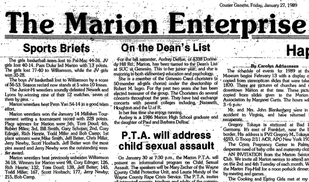Marion's Jerry Newby, another undefeated 167-pounder, was named most outstanding wrestling at the 1989 Midlakes Tournament. SOURCE: Rochester Democrat and Chronicle, Monday, January 16, 1989. Reproduced by armdrag.com with permission.