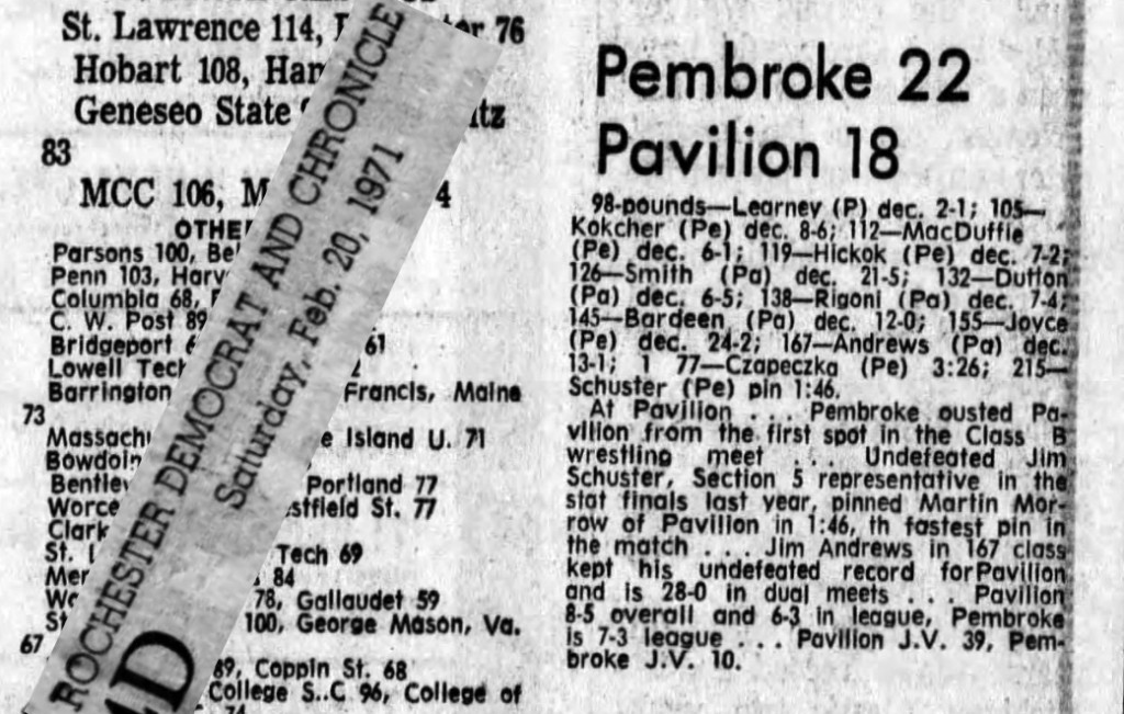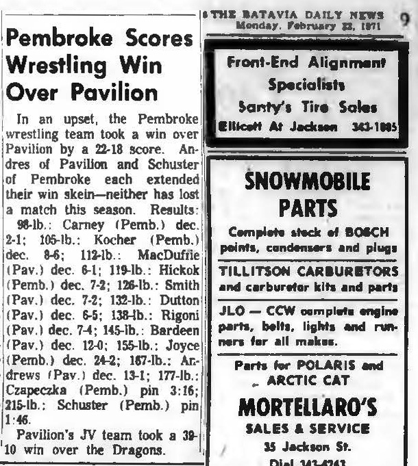 In an upset, the Pembroke wrestling team took a win over Pavilion by a 22-18 score. SOURCE: The Batavia Daily News, February 22, 1971.