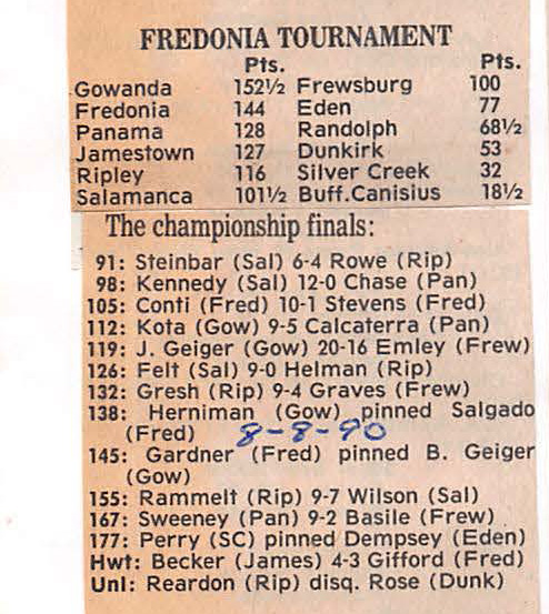 Gowanda topped host Fredonia, 152-1/2 to 144, to win the team title at the 1990 Fredonia Varsity Wrestling Tournament. SOURCE: Unknown. Provided by Herman Guenther.