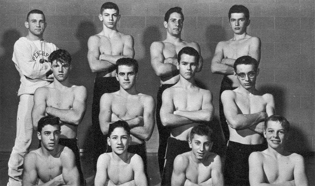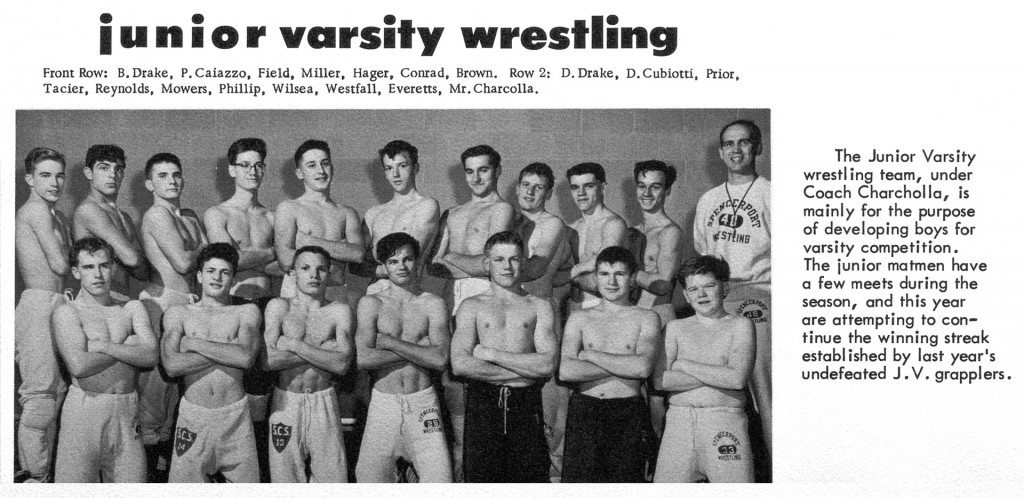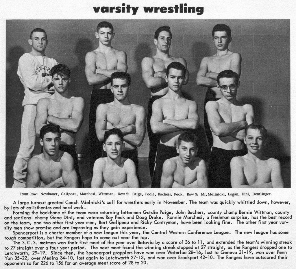 VARSITY WRESTLING. FRONT ROW: Newbauer, Galipeau, Marchesi, Wittman. MIDDLE ROW: Paige, Poole, Bachers, Peck. BACK ROW: Mr. Meilnicki, Logan, Dini, Dentlinger. SOURCE: 1958 Panorama.