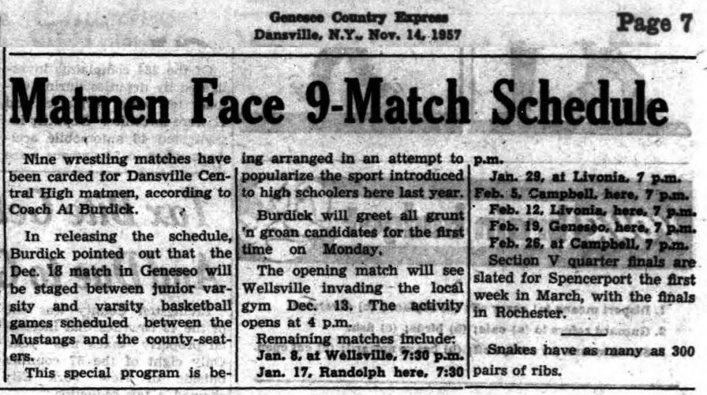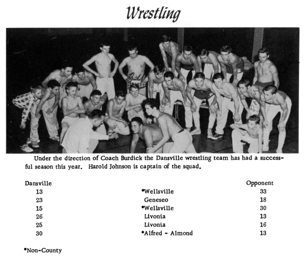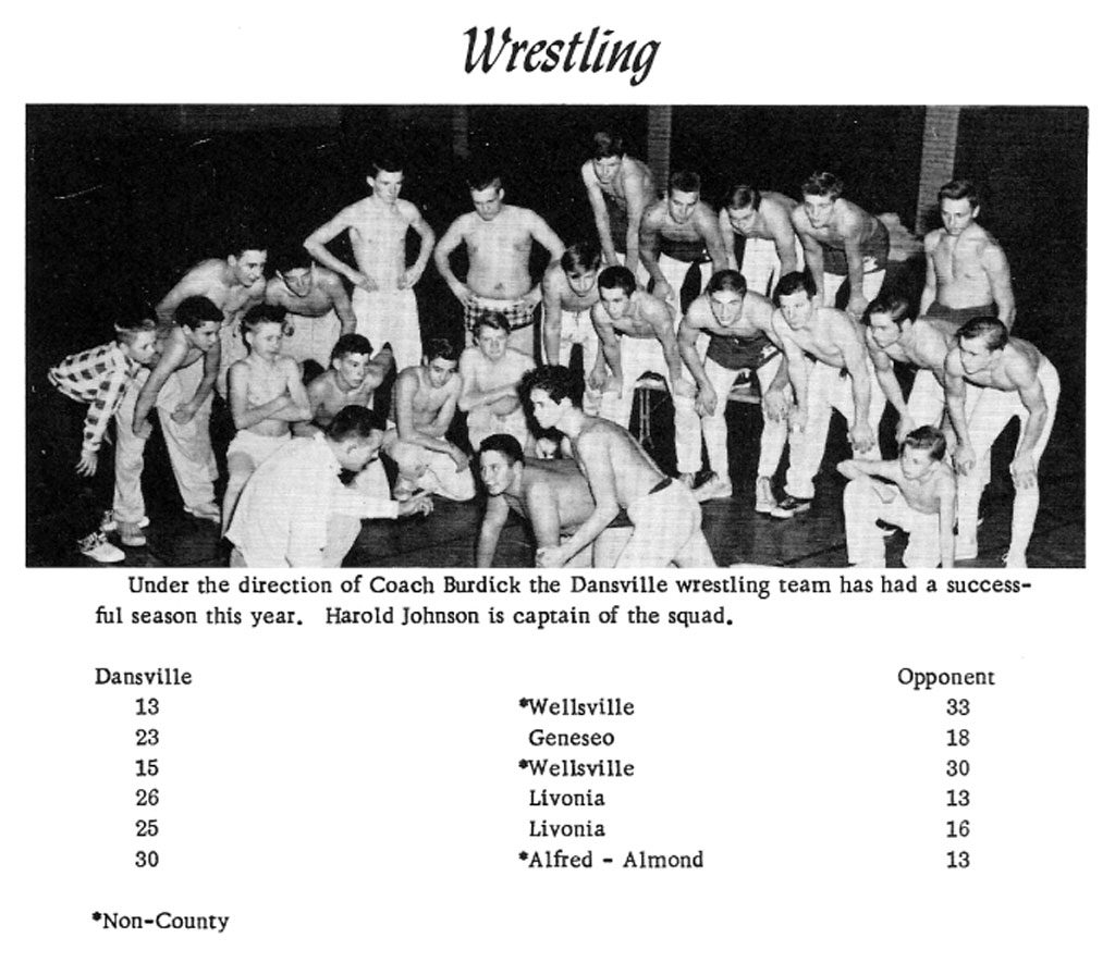 WRESTLING. FRONT ROW: L. Smalt, R. Briggs, R. Banker, R. Lent, L. Hartman, Mr. Johnson, G. Haywood, L. Reed, H. Vogt. BACK ROW: F. Dehmler, J. Martin, J. Clark, J. Brennessel, G. Rauber, D. Chasey, G. Quibell, B. Lauffer, G. Vroman, D. Vanderslice, L. Hynes, C. Minster, W. Lent, T. Vogt. SOURCE: 1958 Danua.