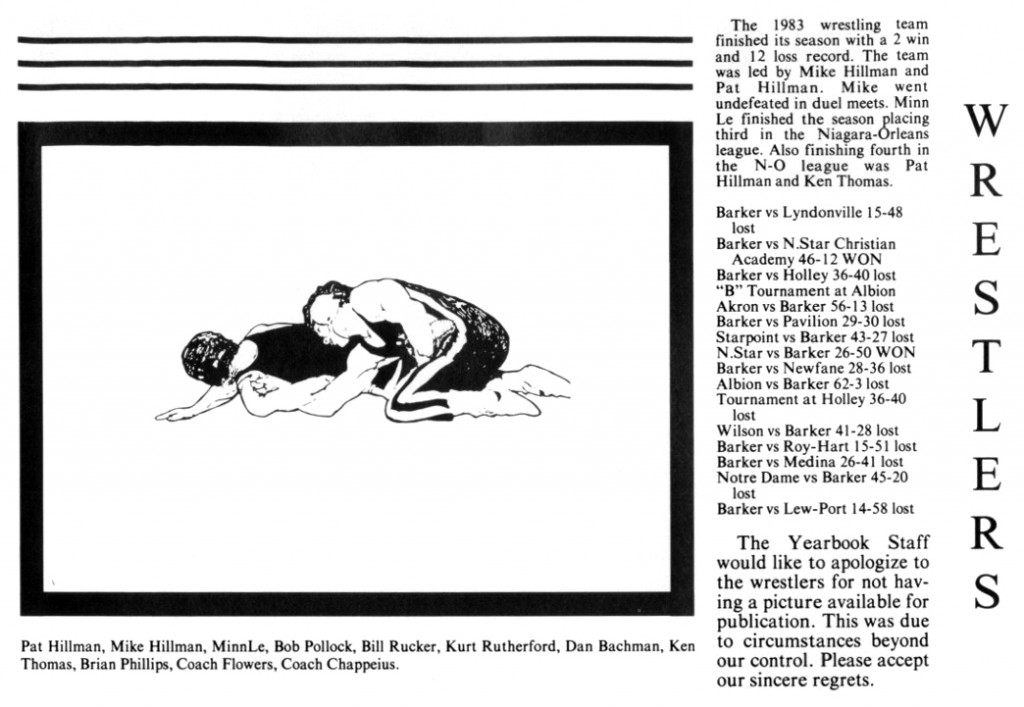 WRESTLING. The 1983 wrestling team finished its season with a 2 win 12 loss record. SOURCE: 1983 Latrator.